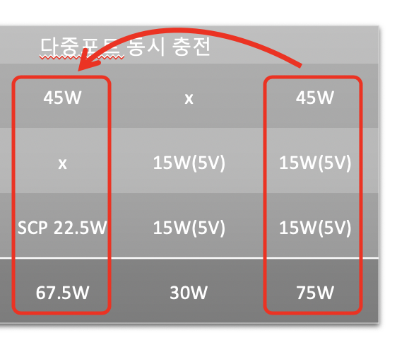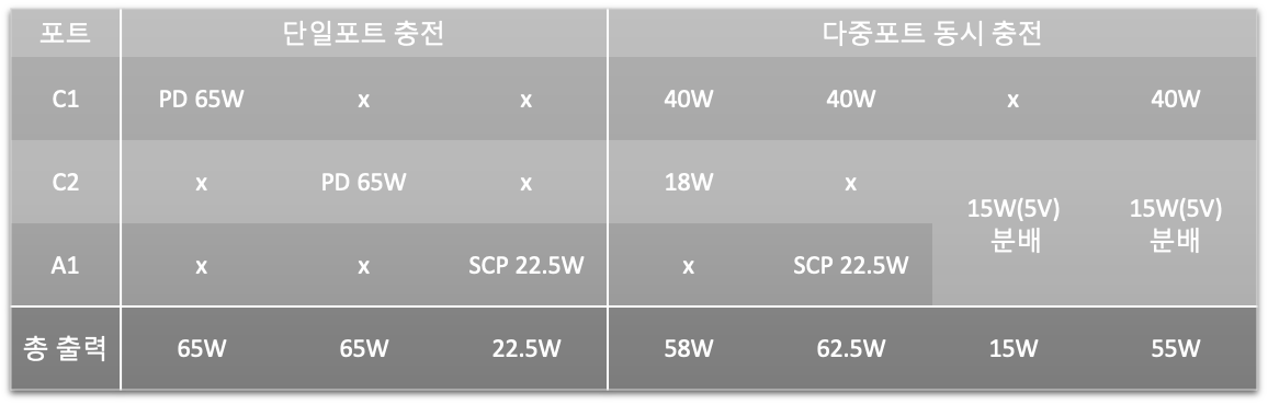 단일포트 사용시 두 제품 모두 출력은 최대 65W로 동일하다.