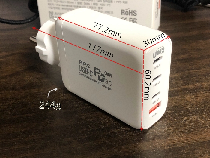 무게는 224g, 본체 크기는 77.2 x 60.2 x 30mm이며, 접지플러그까지 길이는 약 117mm인 꽤 아담한 사이즈다.