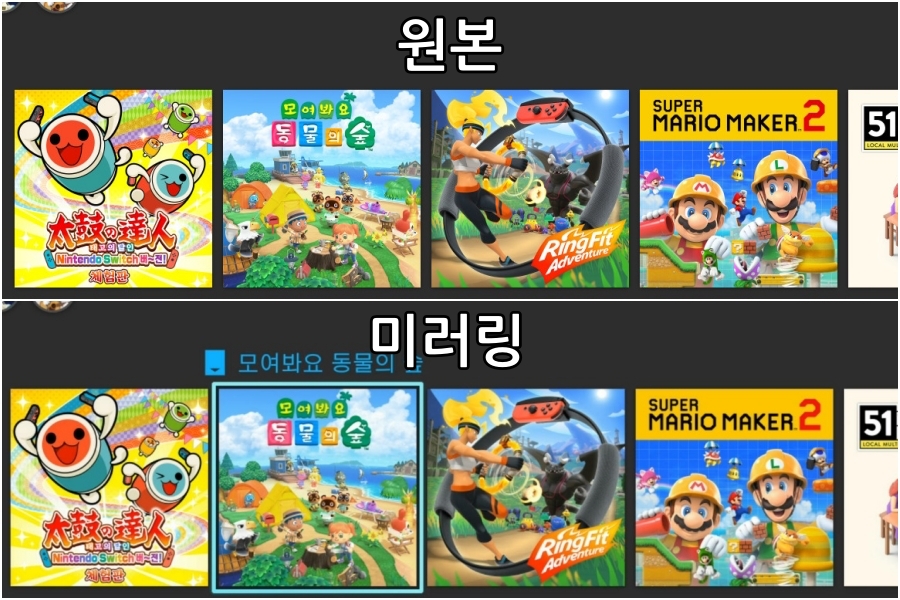 이렇게 붙여놓고 비교하면 미러링쪽의 색감이 좀 더 진한 느낌이 있다.