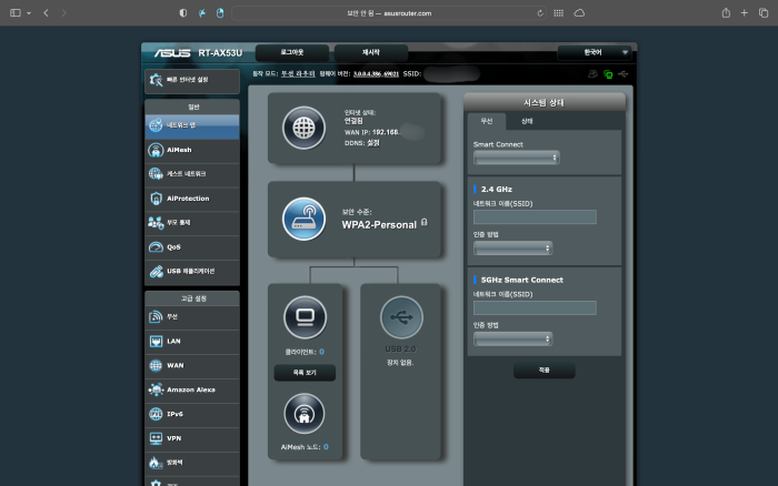 무선 연결 후 192.168.50.1 이나 " http://www.asusrouter.com " 로 접속하면 설정창으로 접속할 수 있다.