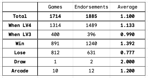 총 1714판의 게임을 기록했으며, 그동안 1885 개 추천을 받았다.