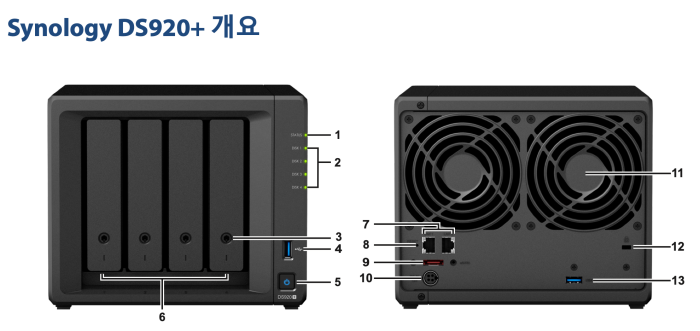 920+ 의 앞 뒤에는 (4번과 13번) USB 3.0 포트가 있다.