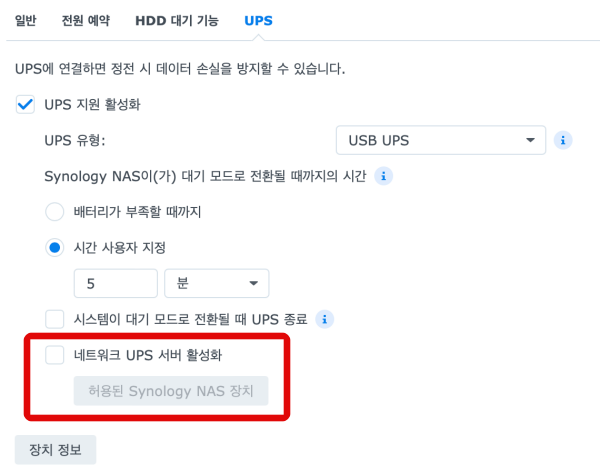 혹시 이런 문제인가 해서 UPS 설정 부분에서 표시한 네트워크 UPS 서버 활성화를 켜고 적용을 시켜봤는데,